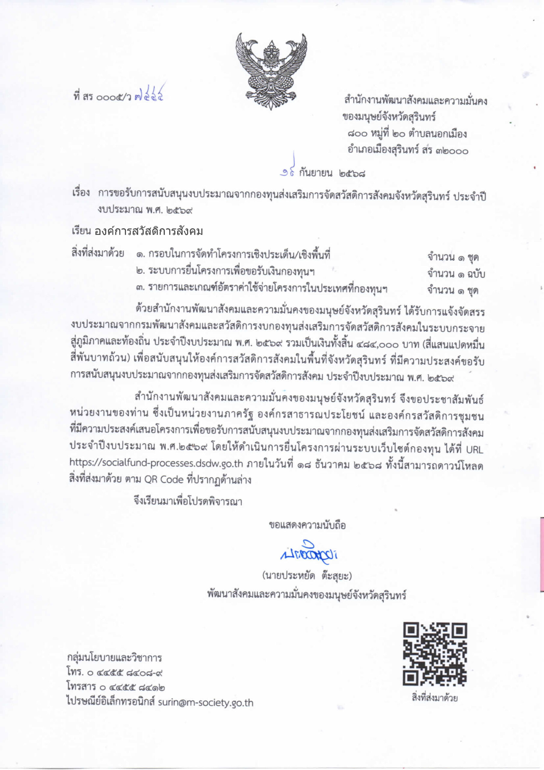 ประชาสัมพันธ์การขอรับการสนับสนุนงบประมาณจากกองทุนส่งเสริมการจัดสวัสดิการสังคมจังหวัดสุรินทร์ ประจำ ...