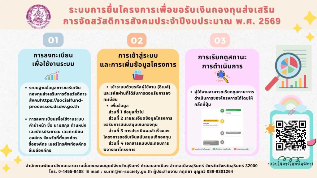 Posted on 26 กันยายน 2025 ประชาสัมพันธ์ การขอรับการสนับสนุนงบประมาณจากกองทุนส่งเสริมการจัดสวัสดิการสังคมจังหวัดสุรินทร์ ประจำปีงบประมาณ พ.ศ. 2569 ประชาสัมพันธ์การขอรับการสนับสนุนงบประมาณจากกองทุนส่งเสริมการจัดสวัสดิการสังคมจังหวัดสุรินทร์ ประจำปีงบประมาณ พ.ศ. 2569 Share: